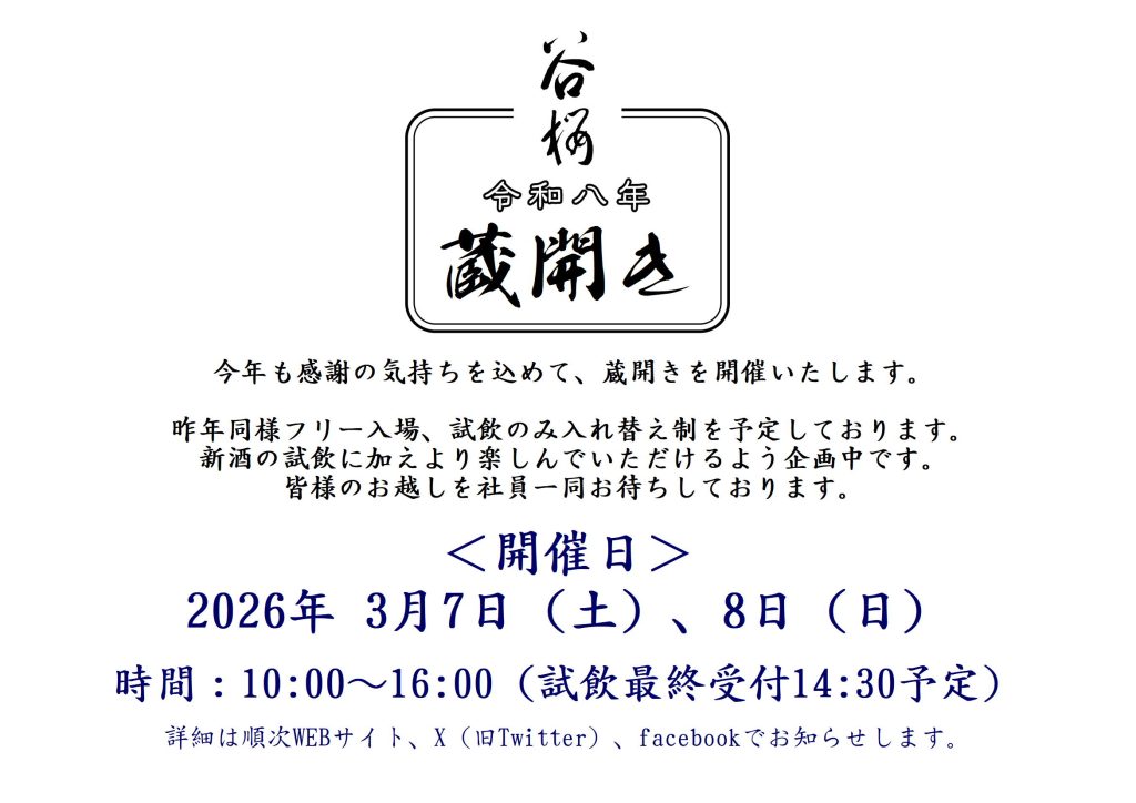 令和8年蔵開き開催のお知らせ 2026.01.20 【さくら組の皆様へ】 本年の蔵開きも予約を行わない方式となります。 後日ご招待状をお送りいたします。 到着まで今しばらくお待ちいただけますようお願いいたします。 一覧へ戻る 次へ